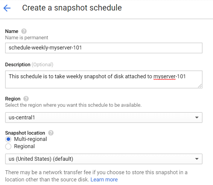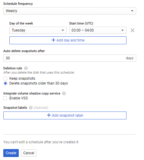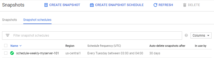Since every snapshots will take some space on disk, please read GCP Pricing for Disks and Snapshots before you configure your snapshot schedules.