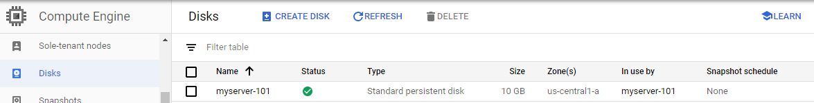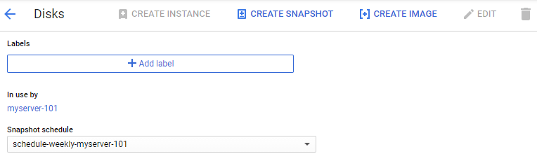 You can see, the disk is used by myserver-101 (which is my VM) but no snapshot schedules attached.
