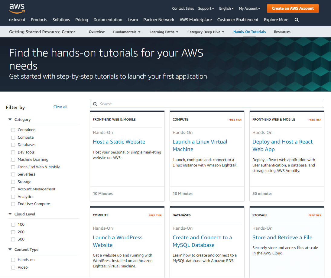 As I told earlier, AWS has arranged a good collection of Hands-on tutorials for engineers to try real life scenarios and implement the same and get real hands-on. Goto aws.amazon.com/getting-started/ and on the right side top menu, you will find Hands on Tutorials. Once you are on the hands-on tutorials page, you will see about 110 tutorials under different categories like containers, database, machine learning, serverless, storage etc. Also you can filter out the items based on your expertise level from the left side.
