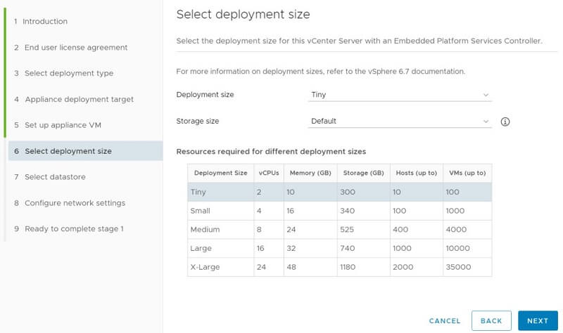 Choose vCenter Server VM specifications.