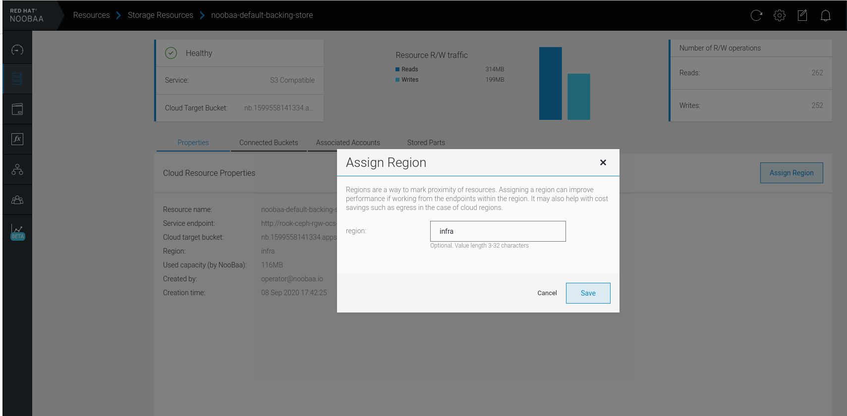 Note : We are using default noobaa-default-backing-store, create your own if you want to use different backing store.1. Assign region to backing store, Resource > Storage Resources > noobaa-default-backing-store > Assign Region > region: infra :