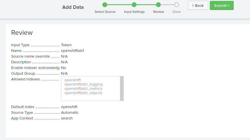 8. Create new HEC token, Settings > Data inputs > HTTP Event Collector > New Token > Name as “openshiftlab1” > Next (Input Settings, add allowed indexes like below” > Review > Submit . Note the Token Value , we going to use this for next step.
