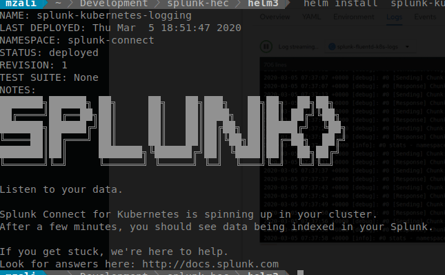 #> helm install  splunk-kubernetes-logging -f splunk-hec.yaml https://github.com/splunk/splunk-connect-for-kubernetes/releases/download/1.4.0/splunk-connect-for-kubernetes-1.4.0.tgz